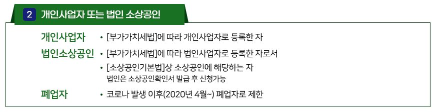 - 법인 소상공인 - 부가가치세법에 따라 법인사업자로 등록된 자로서 소상공인기본법상 소상공인에 해당하는 자(법인은 소상공인확인서 발급 후 신청 가능)
