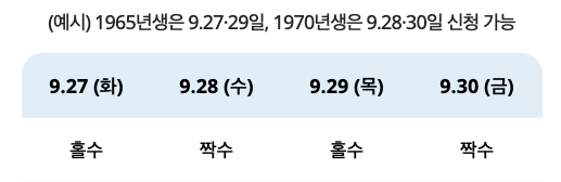 출생년도 끝자리가 해당하는 요일에 신청이 가능하며 4일간 신청 요일은 아래와 같습니다