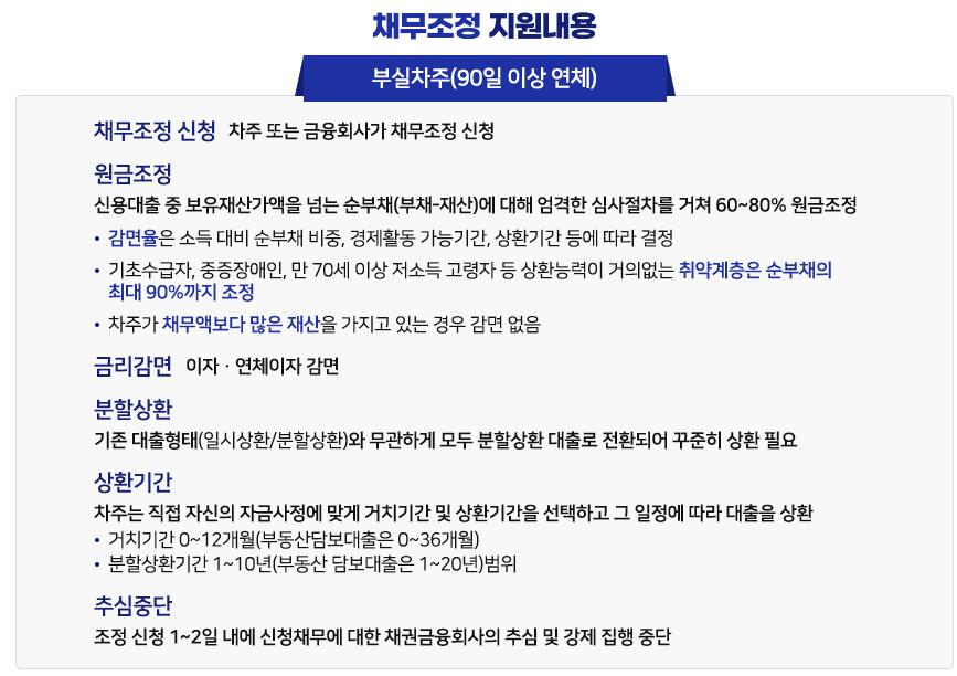 - 기초수급자, 중증장애인, 만 70세 이상 저소득 고령자 등 상환능력이 거의없는 취약계층은 순부채의 최대 90%까지 조정