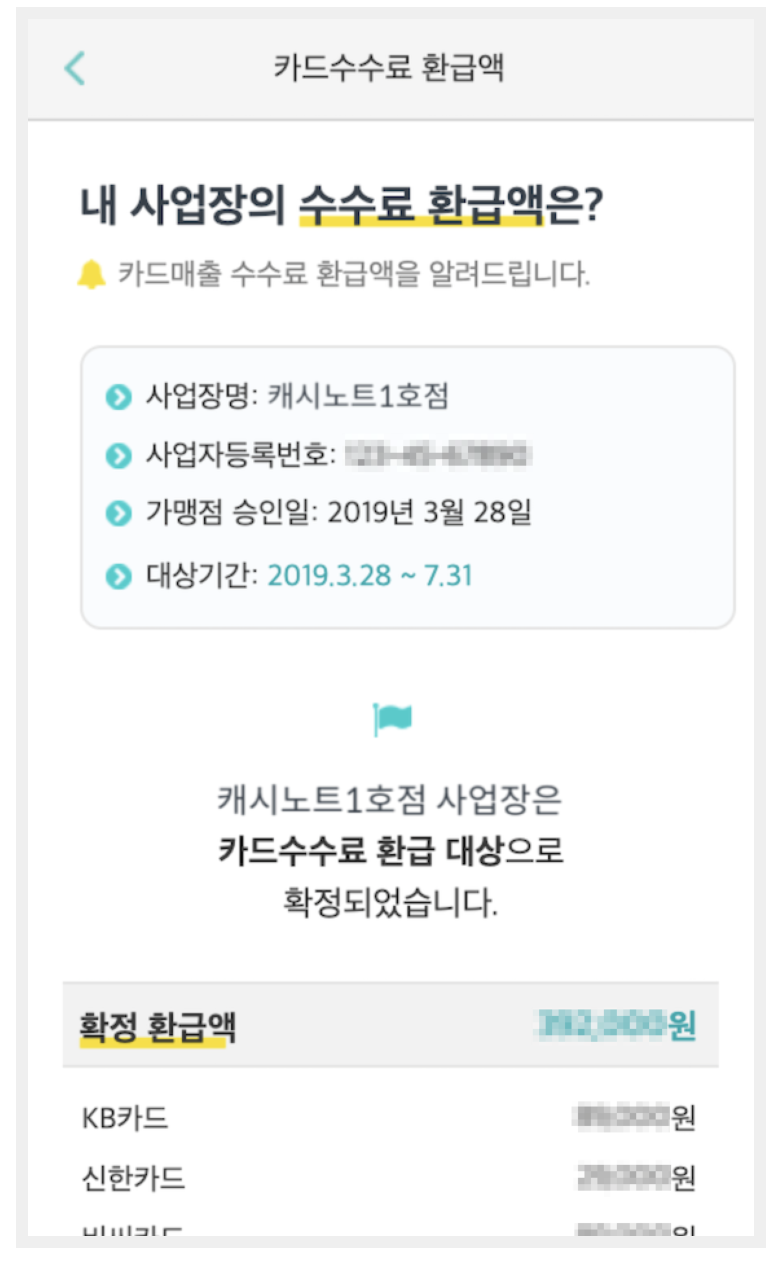 그 후에 7개월의 매출 실적을 통해 영세·중소 가맹점으로 선정이 되면 우대수수료율을 적용받게 되어 기존에 납부한 "기 납부한 일반가맹점 카드수수료- 우대카드수수료율 적용 금액" 만큼 뺀 금액을 환급받게 됩니다.