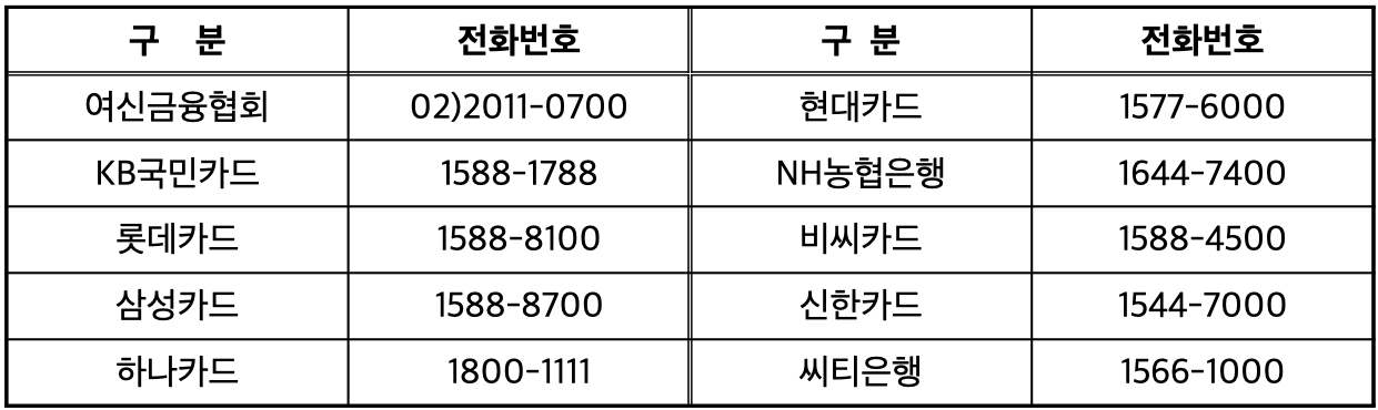 여신금융협회 콜센터 전화번호와 KB국민카드, 롯데카드, 삼성카드, 하나카드, 현대카드, NH농협카드, 비씨카드, 신한카드, 씨티은행 등 각 카드사 콜센터 전화번호는 아래와 같습니다