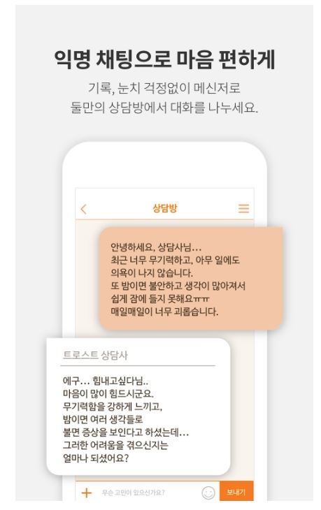 익명이 보장되고 공인된 1급, 2급 심리상담사, 합리적인 비용으로 누적상담 5만건이상을 진행한 심리상담 분야 어플 평점 1위의 트로스트앱입니다