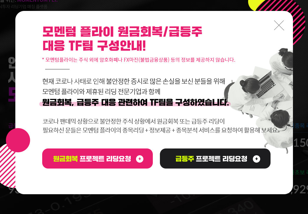 주식 투자 및 종목을 직접 권유하지 않으며, 주식 정보 및 리딩 서비스는 자체 시스템을 통해 검증된 주식 정보제공 리딩 기업이 직접 제공합니다. Momentum FLY - 모멘텀플라이