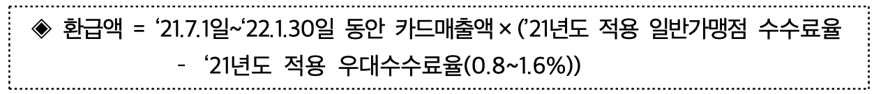 ◈ 환급액 = ‘21.7.1일~‘22.1.30일 동안 카드매출액×(’21년도 적용 일반가맹점 수수료율 – ‘21년도 적용 우대수수료율(0.8~1.6%))