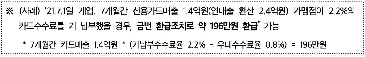 에를들면, ‘21.7.1일 개업, 7개월간 신용카드매출 1.4억원(연매출 환산 2.4억원) 가맹점이 2.2%의 카드수수료를 기 납부했을 경우, 금번 환급조치로 약 196만원 환급 가능가능