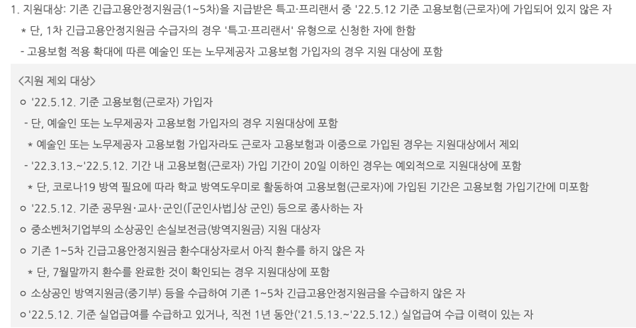 : 기존 긴급고용안정지원금(1~5차)을 지급받은 특고·프리랜서 중 '22년 5월 12일 기준 고용보험(근로자)에 가입되어 있지 않은 자